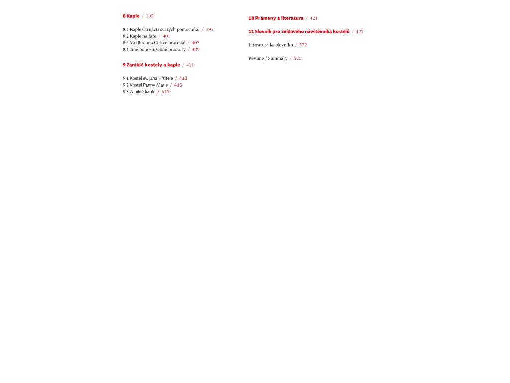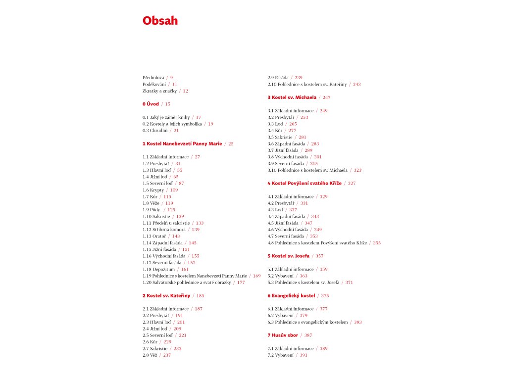 Každá kapitola knihy začíná stručnou historií objektu a pokračuje popisem jeho jednotlivých památek. Celkem je v knize uvedeno více než sedm set památek – obrazů, soch, oltářů, liturgických předmětů, náhrobníků, architektonických prvků a podobně.